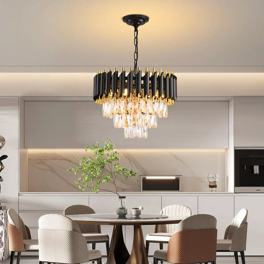 Lustre en Cristal Noir et Or à 3 Niveaux avec Support E14 – Design Moderne Ce lustre en cristal noir et or à trois niveaux incarne l’élégance contemporaine et la sophistication fonctionnelle, conçu pour sublimer tout espace intérieur. Sa structure raffinée, ornée de cristaux K9 transparents, diffuse une lumière éclatante...
