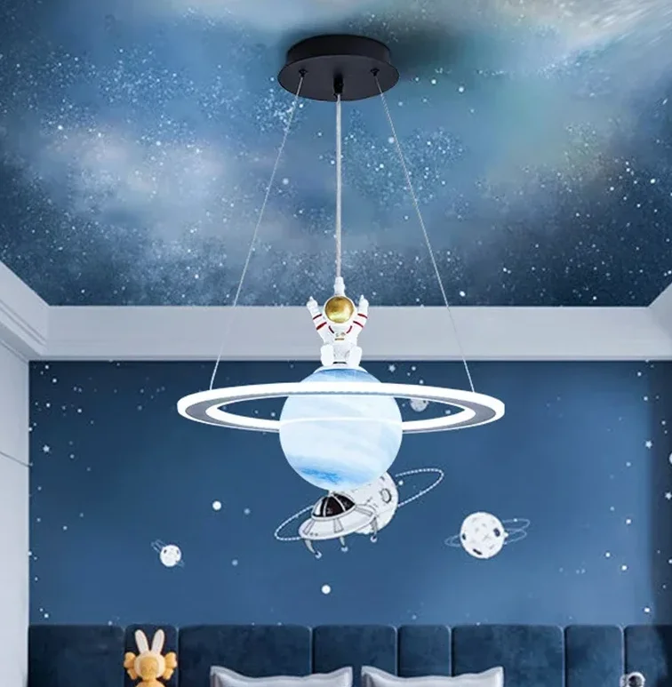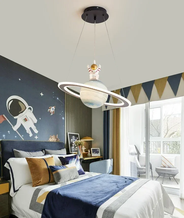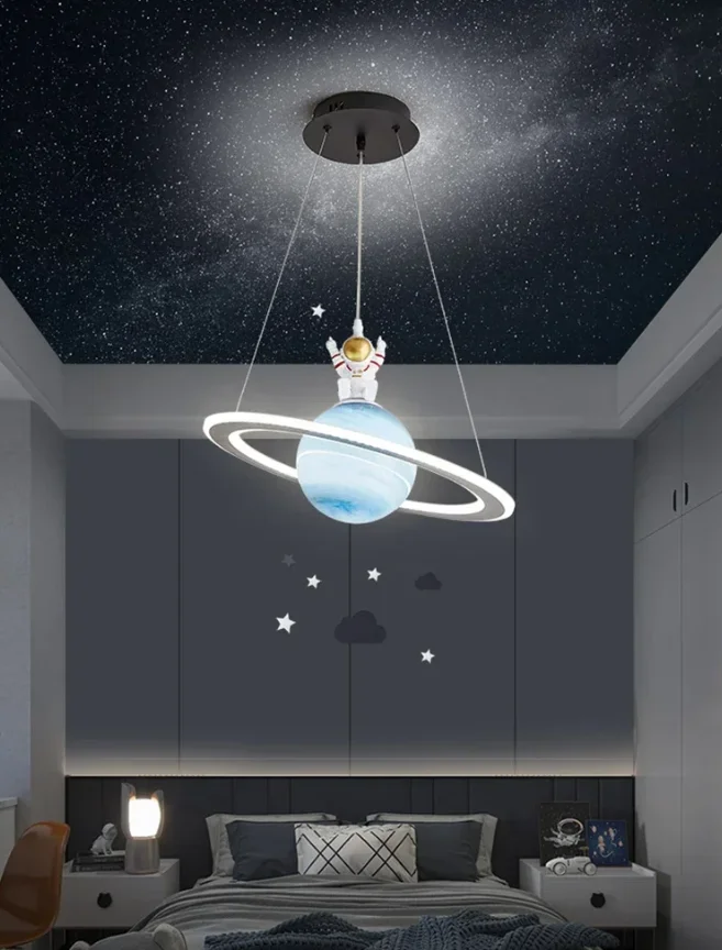 Ce lustre LED au design nordique, inspiré des planètes Terre et Lune avec une touche astronautique, apporte une atmosphère raffinée et contemporaine à tout espace intérieur. Conçu pour sublimer les chambres d’enfant, les salons ou les bureaux, ce luminaire suspendu combine esthétique et fonctionnalité afin de créer une ambiance chaleureuse et accueillante. Sa finition en métal plaqué bleu confère une élégance discrète, tandis que sa lumière LED intégrée assure une diffusion lumineuse homogène et efficace.