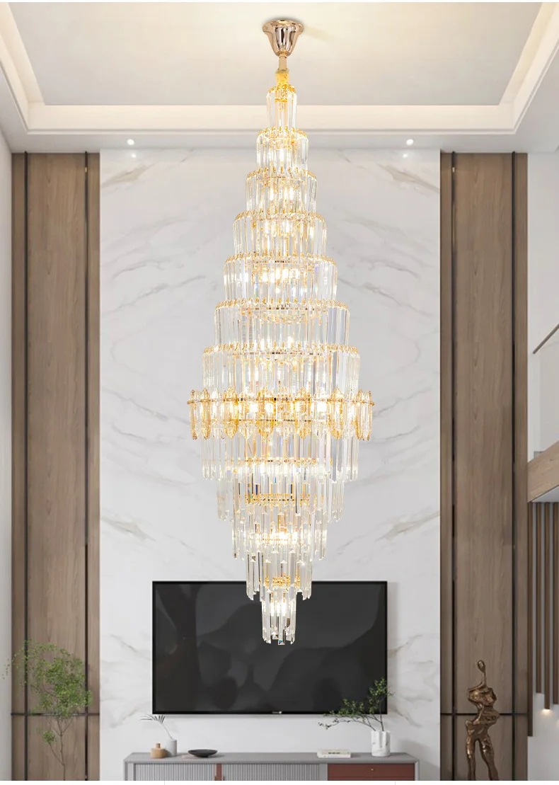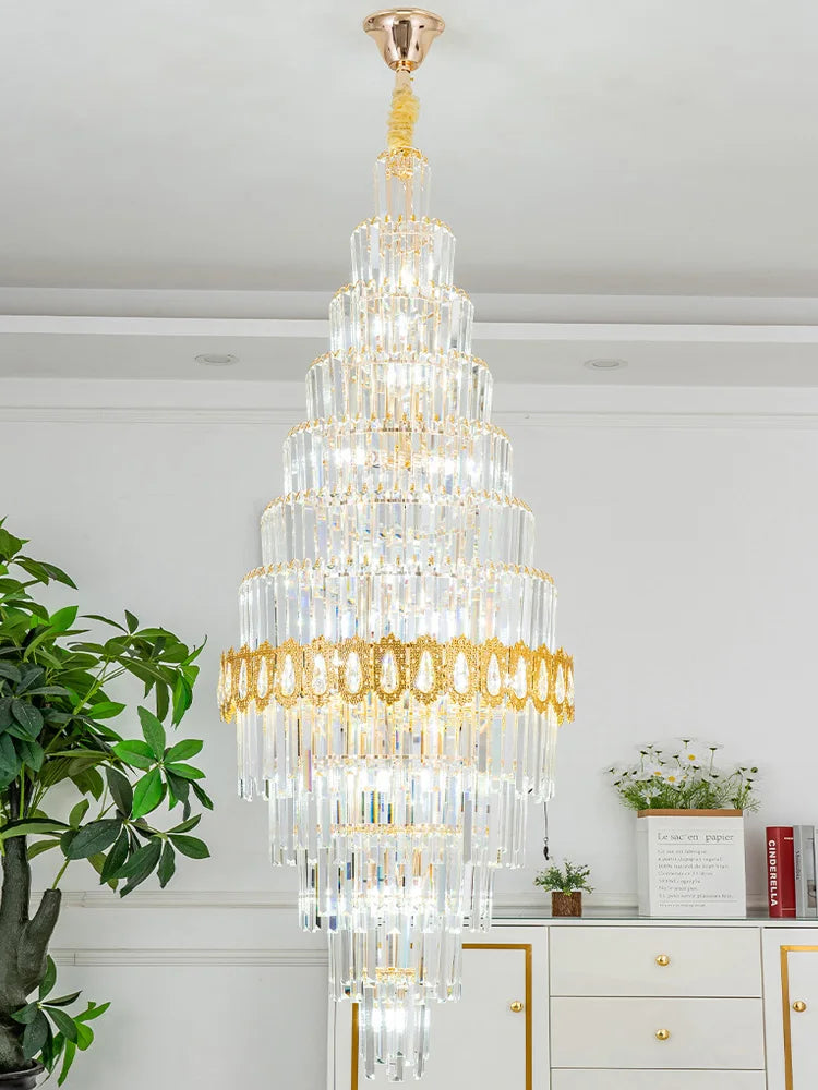 Ce lustre en cristal de luxe incarne l'élégance moderne et la sophistication, conçu pour sublimer tout espace intérieur. Sa structure en métal et cristal, associée à une finition dorée raffinée, crée une ambiance lumineuse chaleureuse et accueillante, idéale pour les salons, villas, duplex ou mezzanines. L’éclairage diffusé par ses ampoules LED intégrées met en valeur les détails architecturaux et le mobilier, tout en apportant une touche de prestige et de modernité à votre décoration intérieure.