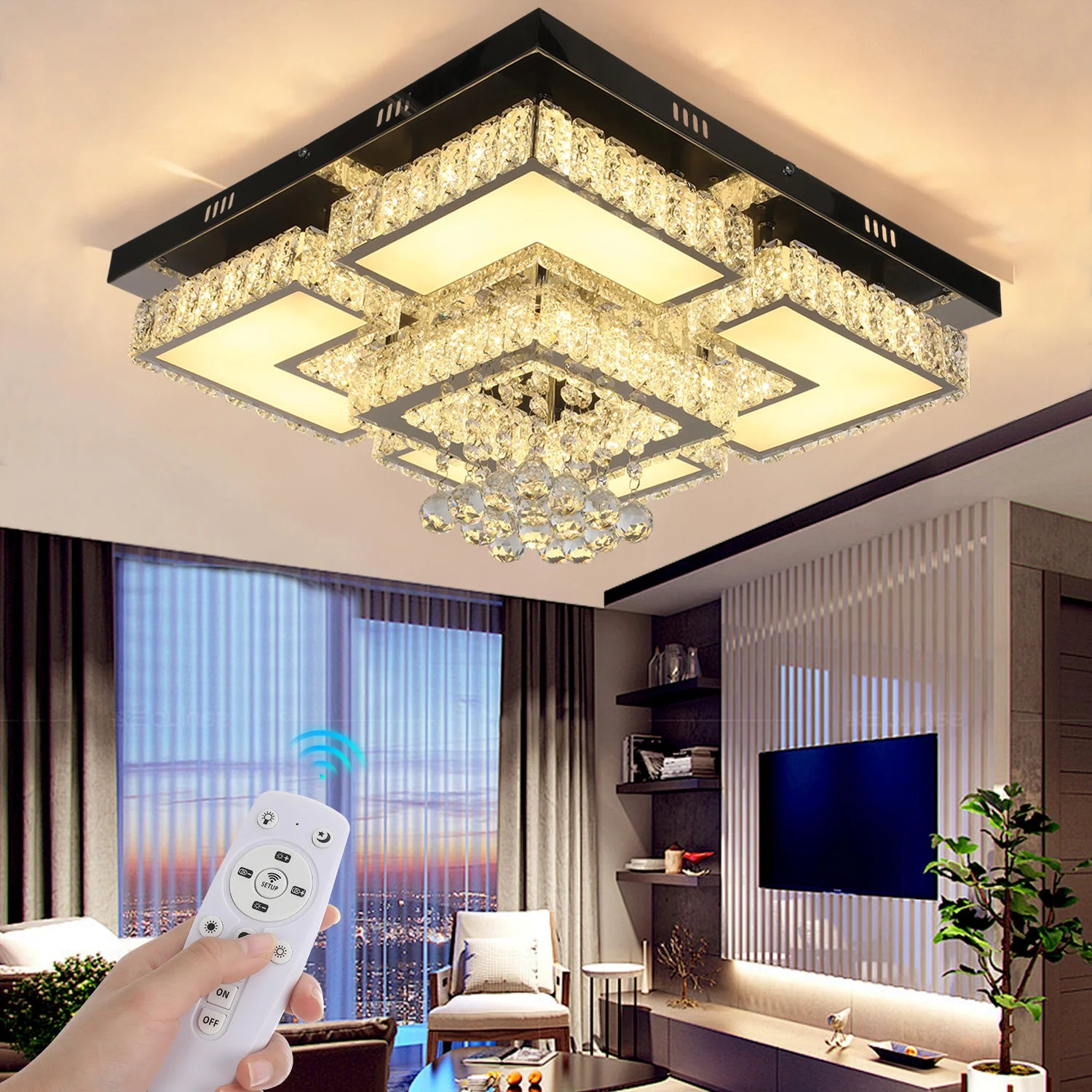 Grâce à sa technologie LED intégrée et à sa télécommande intuitive, ce plafonnier offre une flexibilité d’éclairage optimale. Vous pouvez facilement ajuster la température de couleur entre blanc chaud, blanc neutre et blanc froid, ainsi que moduler l’intensité lumineuse selon vos besoins, pour un confort visuel adapté à chaque moment de la journée. Sa conception robuste en acier inoxydable et cristal garantit une durabilité et une qualité irréprochables, répondant aux exigences des environnements résidentiels et professionnels.